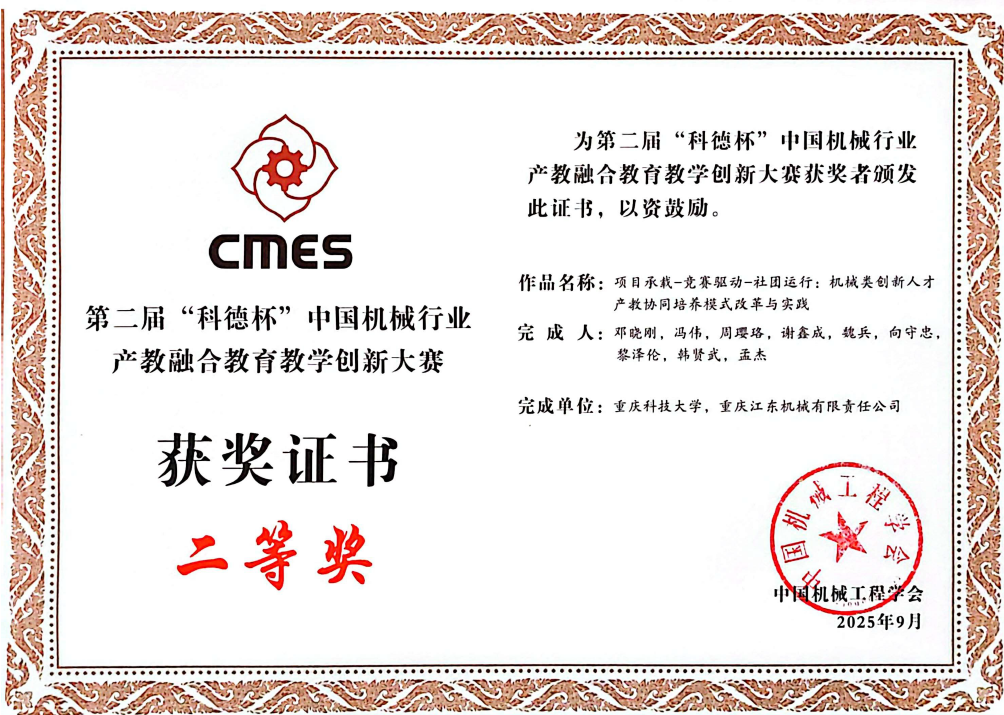 经过区域赛选拔,全国共有143项作品入围总决赛。总决赛经过激烈角逐,最终评选出特等奖4项、一等奖48项和二等奖57项。机械与智能制造学院邓晓刚、冯伟等老师,与重庆江东机械有限责任公司共同合作完成的参赛项目,聚焦机械行业产教融合的实际需求,探索教育教学创新模式,体现了“校企合作、产教互融”的核心理念。最后荣获二等奖。