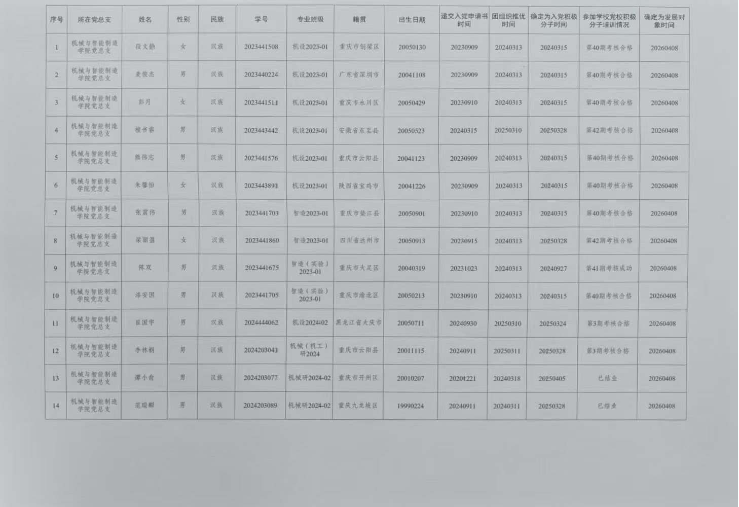 根据我校党员发展有关规定,经机械与智能制造学院各党支部讨论、学院党总支审查,拟确定以下14位同志为2026年上半年发展对象,现予以公示,具体名单如下: