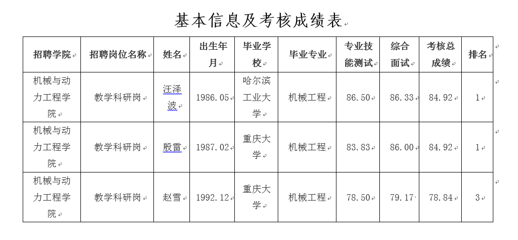根据《重庆市事业单位公开招聘人员实施办法》(渝人发[2006]44号)和《重庆市人力资源和社会保障局关于印发〈重庆市事业单位考核招聘工作人员办法〉等6个公开招聘配套文件的通知》(渝人社发〔2016〕281号)要求,遵照《重庆科技学院2021年公开招聘事业单位工作人员简章》确定的招聘流程及考核程序,机械与动力工程学院及教务处等职能部门联合对汪泽波等3名博士进行了考核。现将其及基本信息及考核成绩予以公示。